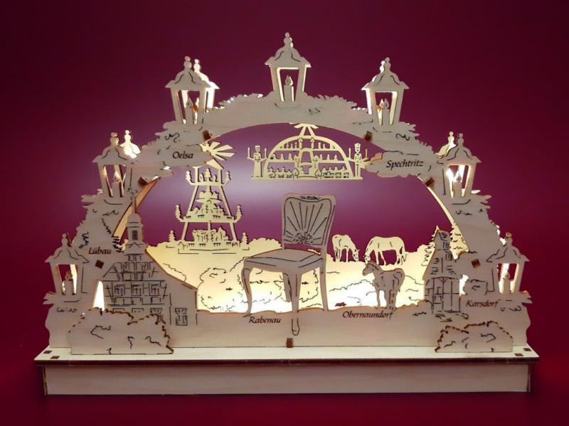 Dieser wunderschöne Schwibbogen vereint Highlights aus Rabenau und seinen Ortsteilen zu einem Gesamtbild. Er wird mit einer kleinen batteriebetriebenen 10er LED-Minilichterkette ohne Timer beleuchtet. Aufgebaut erreicht der Schwibbogen die Maße 210 x 150 x 45 mm und wurde kreiert vom Schmiedeberger Service-Atelier.