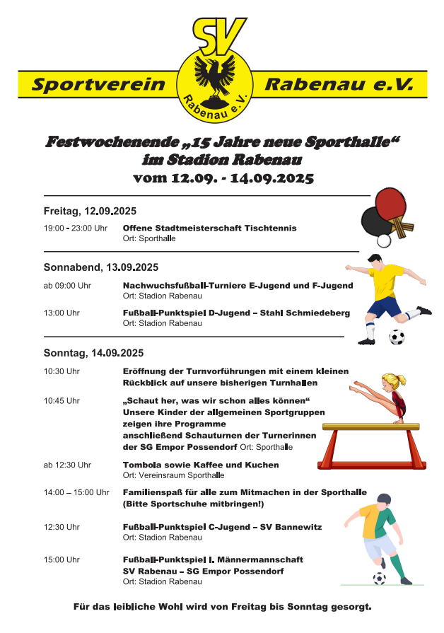 « Alle Veranstaltungen Diese Veranstaltung hat bereits stattgefunden. Festwochenende “15 Jahre neue Sporthalle” im Stadion Rabenau 12. September 2025 – 14. September 2025 | Free Zum Kalender hinzufügen Google Kalender iCalendar Outlook 365 Outlook Live Details Beginn: 12. September 2025 Ende: 14. September 2025 Eintritt: Free Veranstaltungsort Stadion der Möbelwerker Obernaundorfer Straße Rabenau, 01734 Google Karte anzeigen Telefon: 0351 6491207 Veranstalter Sportverein Rabenau Website: Veranstalter-Website anzeigen